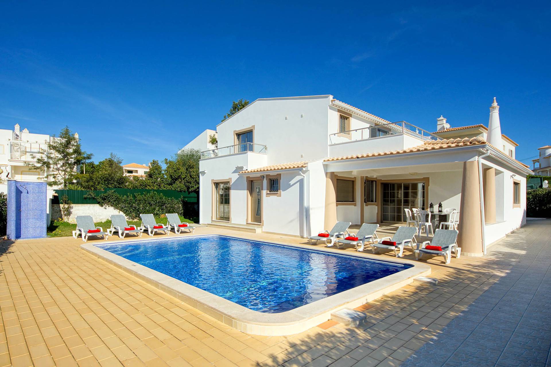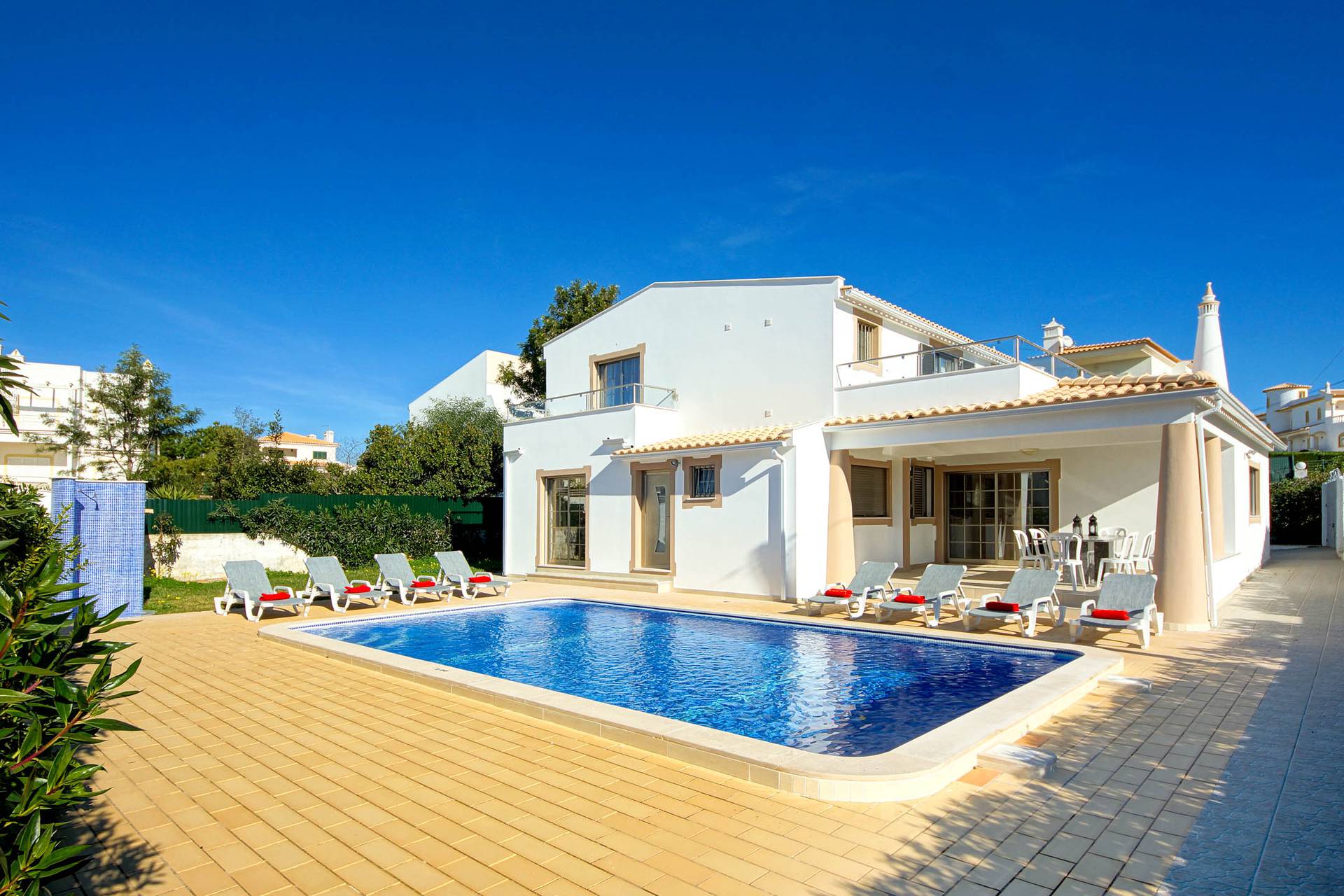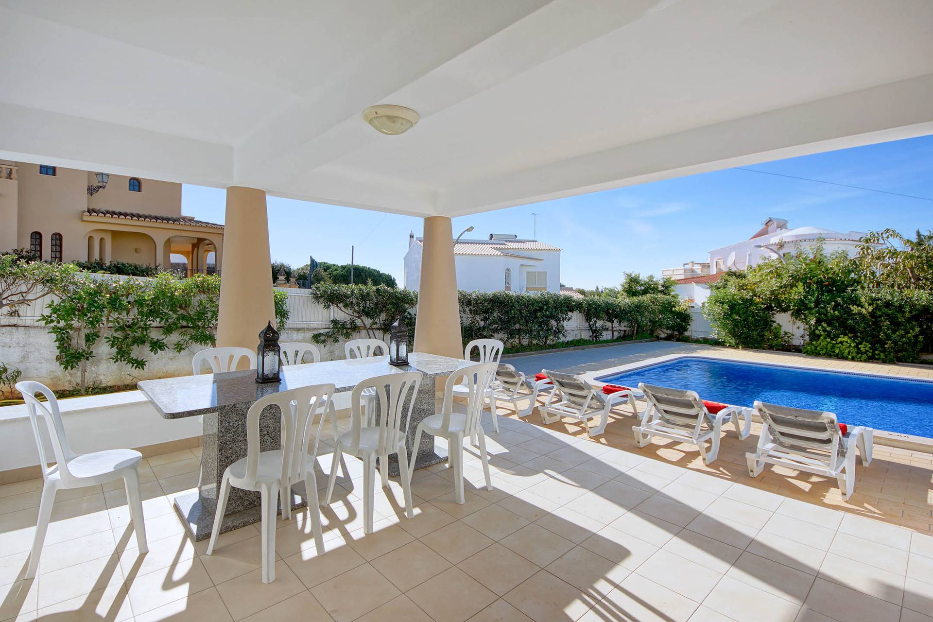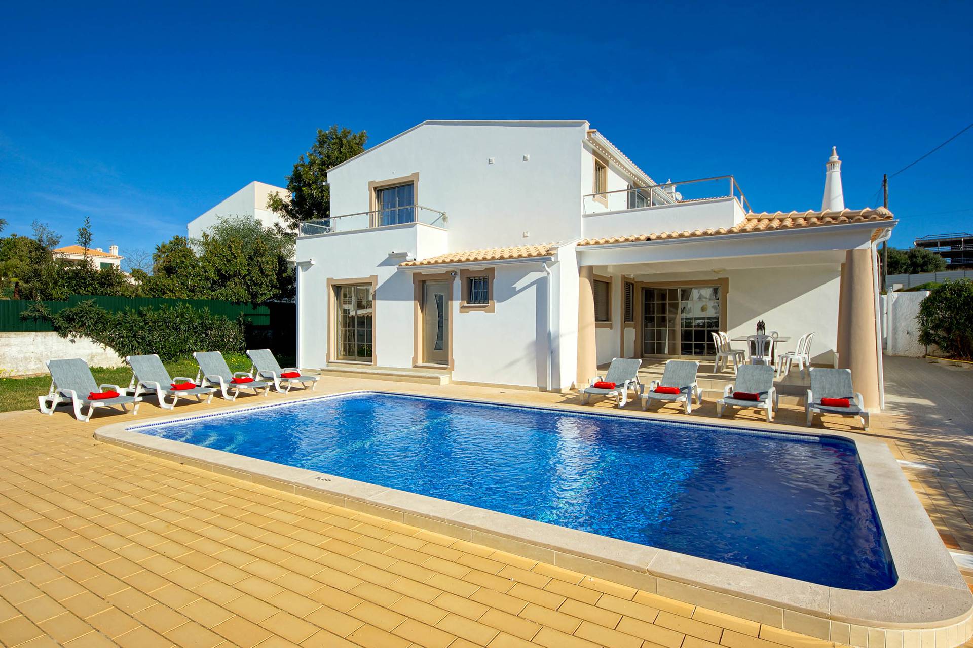 A piscina de 9,00 x 5,00m e a zona de espreguiçadeiras representa o centro das atividades, e o BBQ, a mesa exterior e a mesa de ping-pong complementam a oferta.