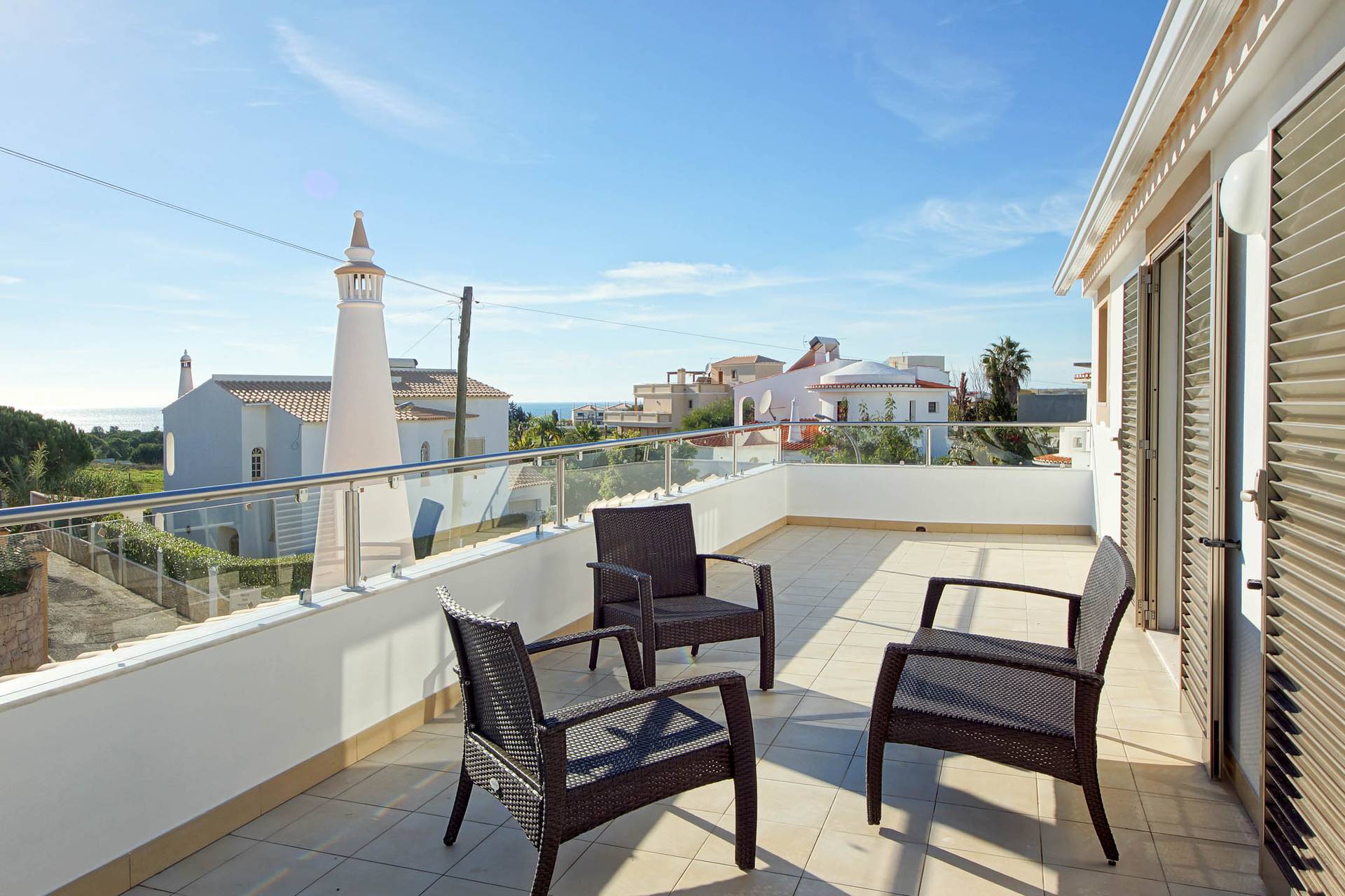 No primeiro andar encontram-se os três quartos, dois com camas individuais e um quarto com cama de casal e todos com terraços e ar condicionado, tal com toda a Vila Evaristo.